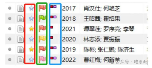 在题录框中,可以对文献进行收藏(黄的星星);可以把文献区分为不同的重要等级(不同颜色的旗子,代表不同的重要程度);可以查看是否对文献进行过笔记的记录(粉色方框代表有笔记)。![]()