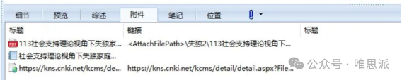 “附件”:如若要对文章主体进行阅读,可以在附件框,点击pdf阅读,也可以点击链接进入知网页面在线阅读。附件中还包含了我们在阅读时做的笔记。(如若附件中没有pdf或网页链接可自行手动右键添加,以方便后期文献的阅读)。![]()