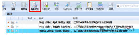 在导入题录后,我们需要检查题录信息是否完整以及是否正确。有缺失或者错误的题录信息,如果是从知网导入的题录,则可以使用NoteExpress自带功能进行自动修复。比如下面这些题录缺少了年份信息,可以点击上栏“智能更新”,软件会自动完善题录信息。![]()