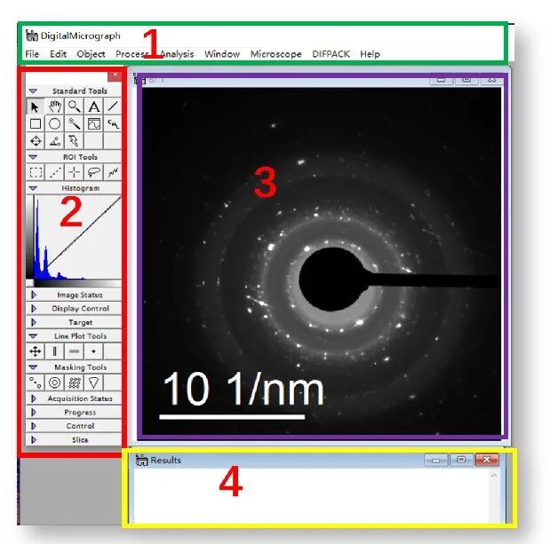 4. 结果(Results):这个文字窗口包含 DM 软件在运行中的一些输出信息。比如图像分析和测量的结果。窗口里面的文字可以被拷贝或以文件格式存储。