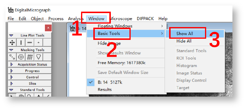 2. 工具(DM Tool)):这些可移动窗口包括标准工具以及多种与被显示图像有关的信息。